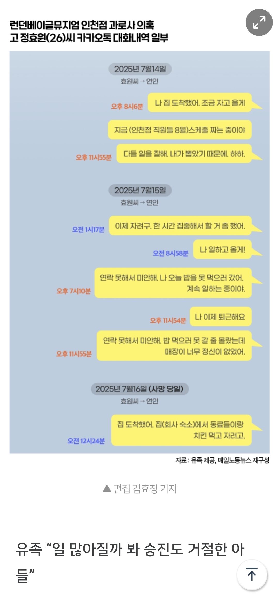 런베뮤 과로사 의혹 고 정효원씨의 카카오톡 대화내역